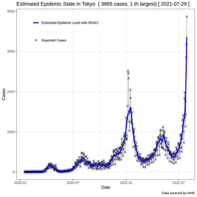RT @Derive_ip: 7月29日(木)の東京都における新規感染者報告数は過去最多の3865人でした🤯週平均の対前週比は162%です。先週の木曜日は1972人だったので先週同日比で1.95倍になりました。10万人あたりの感染者数の週累計は111.84人です。もうなんなの?ほとんど垂直上昇だよね😭3日連続で過去最多を更新です😭 pic.twitter.com/tE5aZZbw4s
