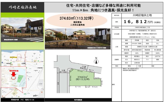 □川崎区塩浜売地 □374.63㎡(113.32坪) □11m×6m公道角地 □現況更地 □多摩川スカイブリッジ開通で注目のエリア スーモ suumo.jp/tochi/kanagawa… pic.twitter.com/9BxLHk91aC