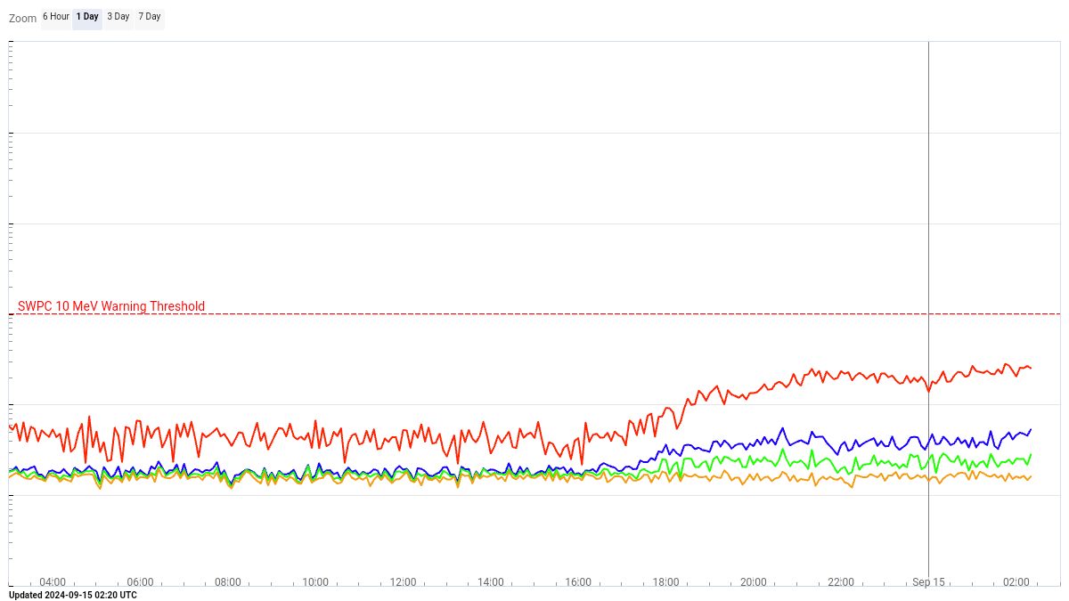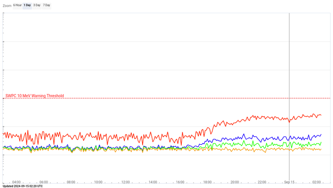 放射線加速器としての衝撃波が地球に向かってきています。地球到来のタイミングで10 MeVプロトンフラックスがピークになると思います。明日月曜の夜にかけて、このグラフの赤い線が尖りはじめたら、いよいよです pic.x.com/svtqz3jyq9