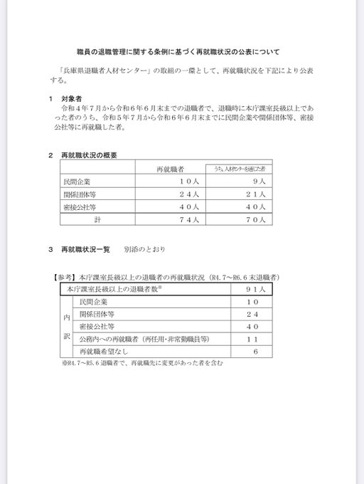 さらに兵庫県知事の斎藤元彦さんが「天下り改革を進めていた」とかいう与太話が流れてきていたが 県のホームページに開示されている通り、今年度6月まで普通に関係先や民間企業にも再就職していて 特段何か改革したという話でもありませんな…。 落ち度もないけど敵ができるほど改革したわけでもない pic.x.com/4vyohljlqb