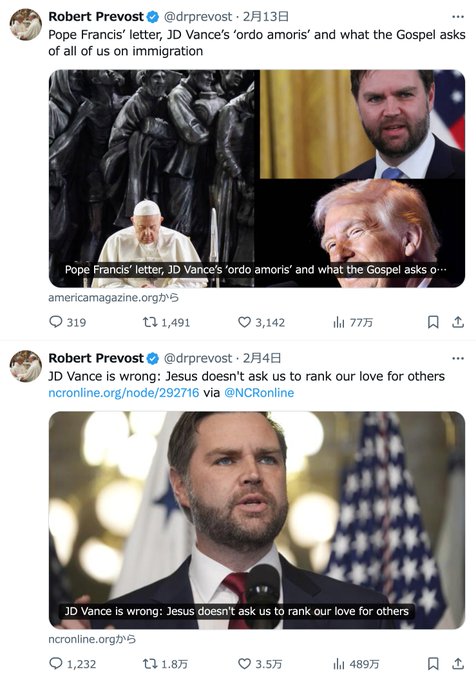 アメリカ人教皇が誕生したのにJDヴァンス副大統領の反応がないと思ったら、プレボスト枢機卿の最後のポストがこれでした💦 pic.x.com/WM2YEiEtMF