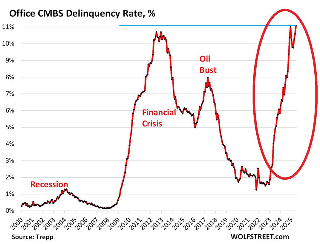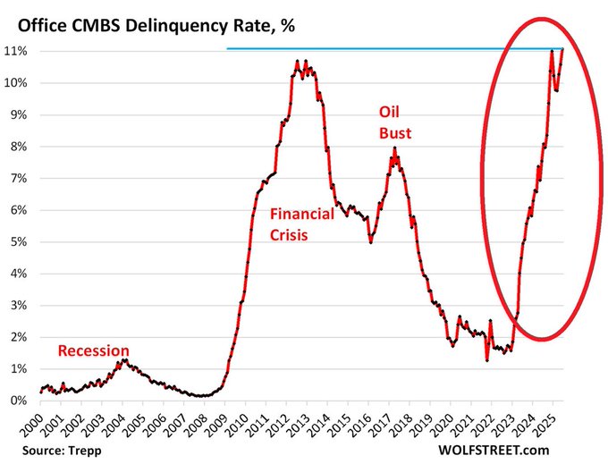 米国のオフィス向け商業用不動産担保証券の延滞率は、11.1%へと急上昇し過去最高値を更新した。これはリーマンショック後の危機的水準をも上回る深刻な状況である。オフィス市場の信用不安は一段と拡大している。商業用不動産市場全体の危機は未だ収束の兆しが見えずむしろ悪化の一途をたどっている。 pic.x.com/eFCBiHgCop