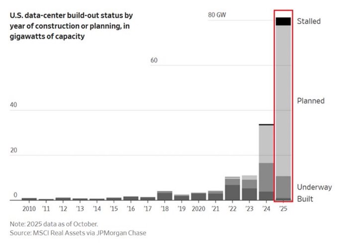 米国ではデータセンター建設が急拡大し、総容量は約80GWに達した。理論上6,000万世帯分の電力に相当し大半が今後建設予定だ。AI競争の本質は、モデル性能より先に「どれだけ電力を確保できるか」へ移行している。エネルギー自給率1割の日本は、自国内でAI革命を完結させることが益々難しくなっている。 pic.x.com/YlUo39jvZl