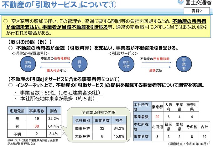 「不動産引取サービス」については国土交通省から注意喚起が出ています。 宅建業免許を持たない事業者と取引をする場合、宅建業者とは異なり保証協会への加入や供託金による保証措置がありません。 損害や紛争が発生した際、金銭的な補償が困難になることが考えられます。 くれぐれもご注意下さい。 pic.x.com/ZBF4rxNnj0