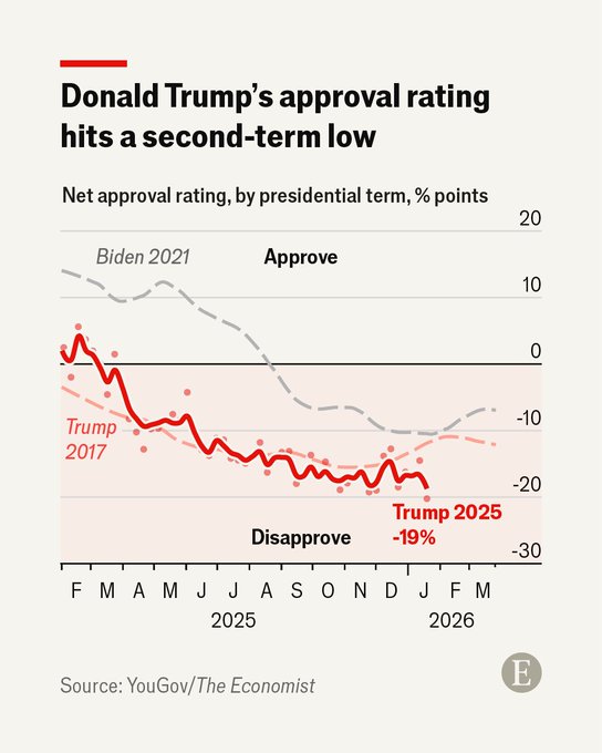 One year into Donald Trump’s second term, Americans do not seem happy. The president’s approval rating has now fallen to -19%, as our interactive tracker shows: econ.st/49OMd8h pic.x.com/zAMO7wdbGX