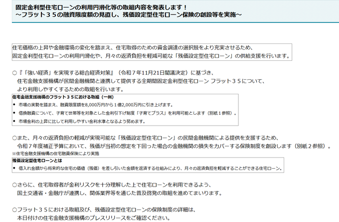 📢国土交通省が「固定金利型住宅ローン」の、利用円滑化に関する取組内容を発表! 👉フラット35の融資限度額の見直しと、残価設定型住宅ローン保険の創設等を実施 【フラット35の取り組み】 ✅融資限度額を8,000万円以下から1億2,000万円以下に引き上げ ✅床面積の要件を70平米以上から50平米以上に緩和 ✅借入期間の基準を35年から40年に延長 ✅借換融資について、子育て世帯等を対象とした金利引下げ制度「子育てプラス」の利用が可能に 【残価設定型住宅ローン保険の創設】 残価が当初の想定を下回った場合の金融機関の損失をカバーする保険制度を創設 💡住宅取得者が金利リスクを十分理解した上で住宅ローンを利用できるよう、国土交通省・金融庁が連携し、関係業界等を通じた普及啓発の取組を進めるとのことです。 #フラット35 #住宅ローン #固定金利