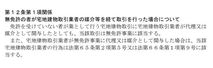 @kanri_man2103 そこは個別の判断になるかと思いますが、宅建業法ガイドラインには、宅建業者が無免許事業に代理又は媒介として関与した場合は、当該宅建業者の行為は65条2項5号又は第66条1項9号に該当するとありますから、業務停止または免許取消の可能性があるということになります。 pic.x.com/orlFEX4Qk2